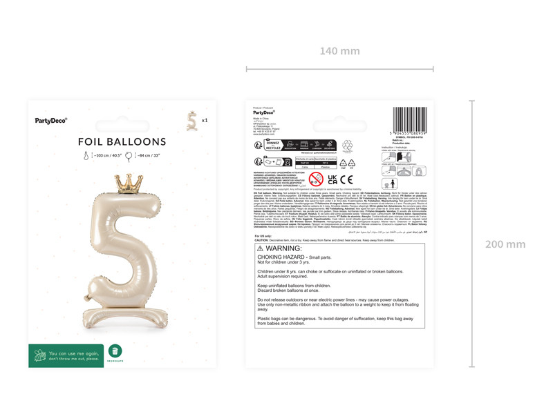 ''5'' számú álló fólia lufi, 84 cm, világos krém
