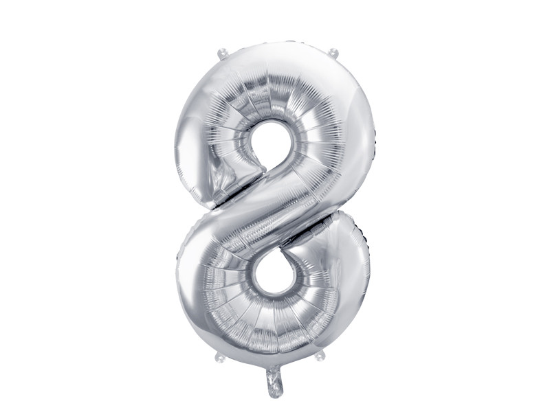 8-as számú fém fólia lufi ezüst színben, felfújás előtti méret kb. 86 cm (34''), méret felfújás után kb. 72 cm (28"). Levegővel és héliummal felfújható. A készlet tartalmaz egy szívószálat. A léggömb önzáró. Horgokkal rendelkezik a dekoráció egyszerű rögzítéséhez.