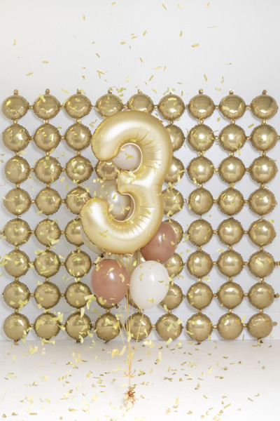 Szaténfólia 3-as számú arany lufi, felfújás előtti méret kb. 100 cm (39''), méret felfújás után kb. 86 cm (34"). Levegővel vagy héliummal felfújható. A készlet tartalmaz egy szívószálat. A léggömb önzáró. Horgokkal rendelkezik a dekorációkhoz való könnyű rögzítéshez.