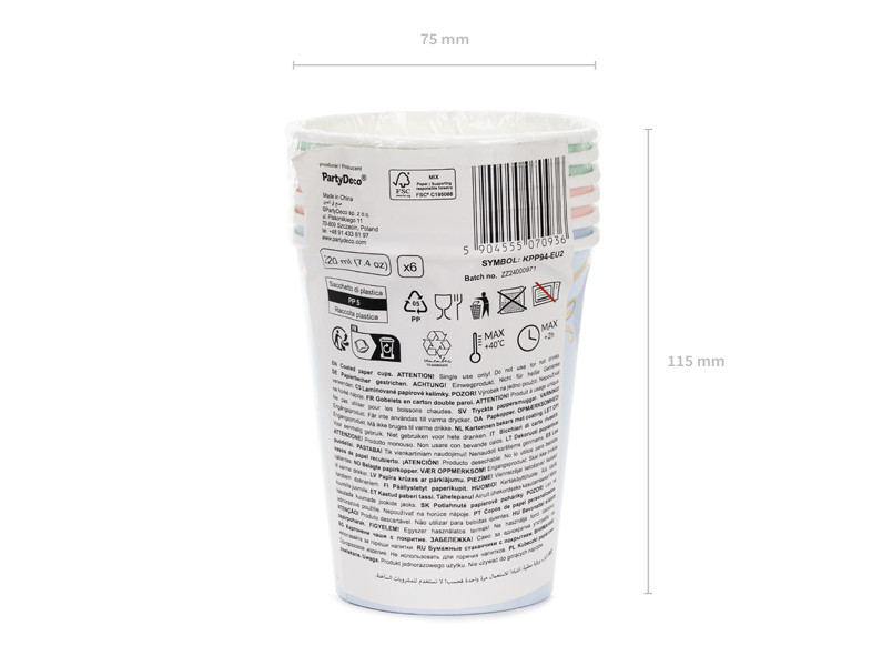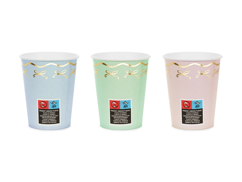 Paper cups Bows, packaged in sets of 2 pieces in colors: blue, green, and pink, with a capacity of approximately 220 ml (7.4 oz). Single-use product. Do not use for hot beverages. The drink cups contain markings required by the Commission Implementing Regulation (EU) 2020/2151 of 17 December 2020 laying down rules on harmonized specifications regarding the labeling of single-use plastic products listed in Part D of the Annex to Directive (EU) 2019/904 of the European Parliament and of the Council on the reduction of the impact of certain plastic products on the environment. The product contains a label only in Polish, German, Czech, French, Dutch, Slovak, Slovenian, and Bulgarian. (1 pkt / 6 pc.)