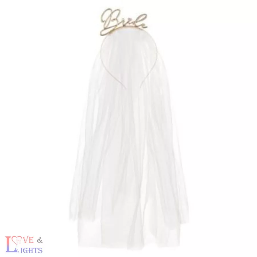 Lánybúcúsra tökéletes választás ez az arany színű bride feliratú fejdísz, 80 cm fehér tüll fátyollal!