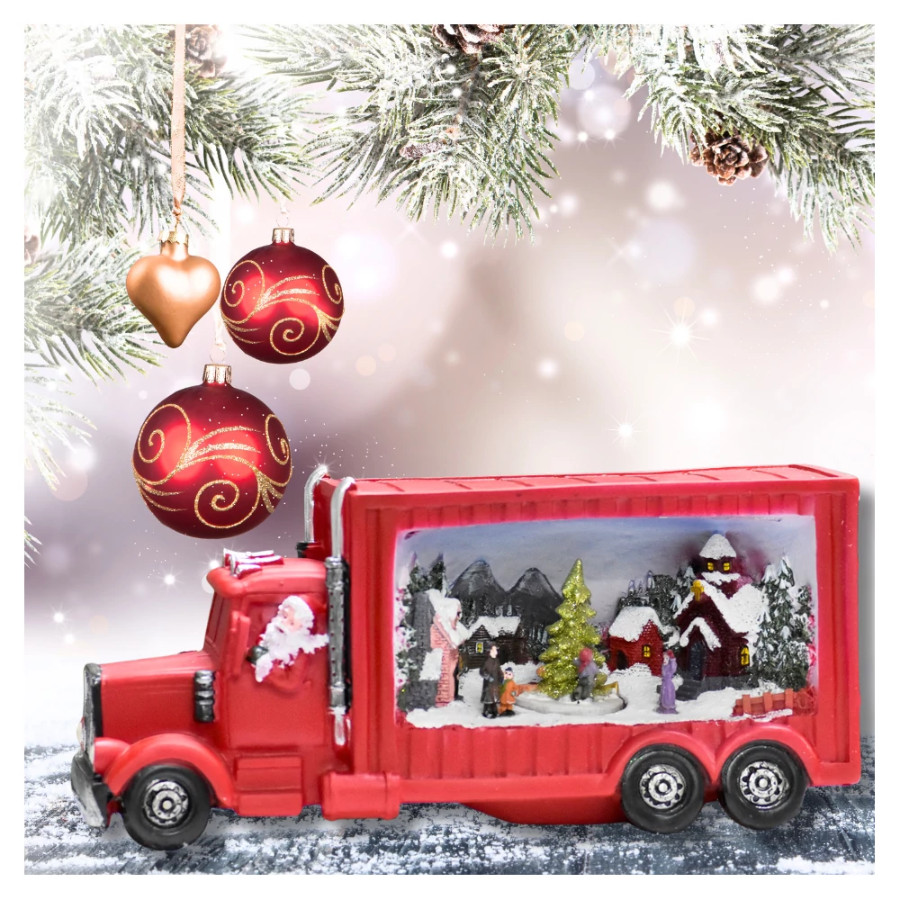 Mikulás kamionja, amibe bekukkantva egy kisváros makettje bújik meg, házakkal, égbolttal, arany forgó fenyővel és a város lakóival.