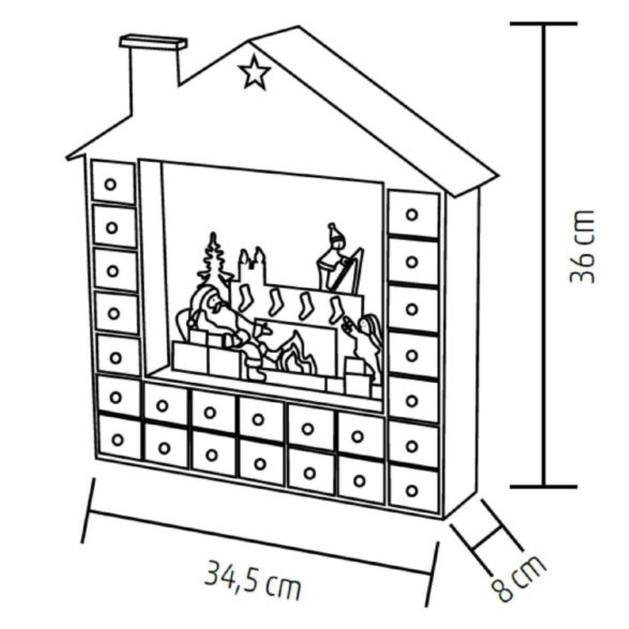 A 34,5 × 8 × 36 cm-es méret ideális a polcra, komódra vagy asztalra helyezve, anélkül hogy sok helyet foglalna. A LED világítás 2 db AA elemmel működik (az elemek nem tartozékok), így a naptár bárhol könnyen elhelyezhető – nincs szükség konnektorra vagy kábelekre. Az elemes tápellátásnak köszönhetően biztonságos és mobilis használatot biztosít, különösen kisgyermekes otthonokban.