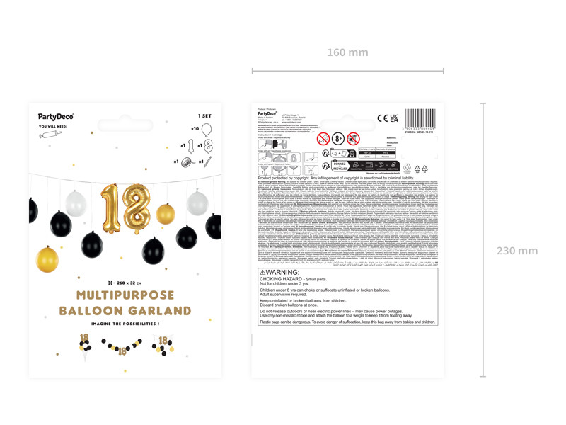 Léggömbfüzér 3 az 1-ben - 18. születésnap fekete, arany és fehér színben, a készlet tartalma: latex lufi (10 db), fólia lufi (2 db), szalag (25 m) és papírszalma. Méret összeszerelés után kb. 260 x 32 cm. A füzér 3 összeszerelési lehetőséggel rendelkezik, a kézikönyv tartalmazza.