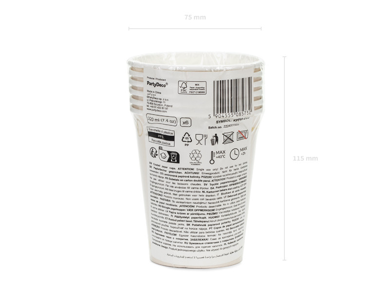 Paper cups in beige color with a shiny golden print, height approx. 9 cm, capacity approx. 220 ml (7.4 oz). The beverage cups contain markings required by the Commission Implementing Regulation (EU) 2020/2151 of 17 December 2020, establishing rules on harmonized specifications regarding the labeling of single-use plastic products listed in Part D of the Annex to Directive (EU) 2019/904 of the European Parliament and of the Council on reducing the impact of certain plastic products on the environment. The product label is available exclusively in Polish, English, Maltese, Swedish, Finnish, Danish, Italian, and Lithuanian. (1 pkt / 6 pc.)