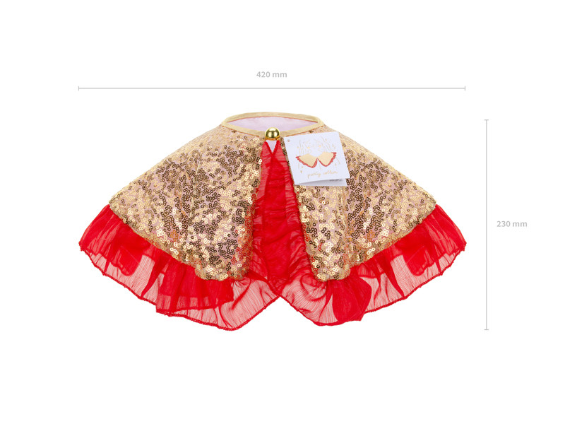 Ez a dekoratív gallér arany flitterekkel és élénk piros fodorral tűnik ki, ami különleges alkalmakra válik ideálissá.