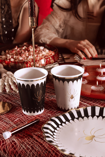 Ez a 6 darabos papír pohár szett elegáns fekete és bézs árnyalatú poharakat tartalmaz, mindegyiken csillogó arany pókminta díszíti, így különleges hangulatot kölcsönöz bármilyen alkalomnak.
