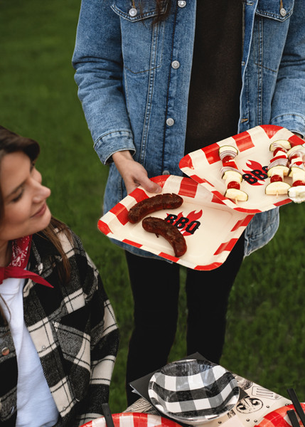 Kisméretű, 26x26 cm-es négyzet alakú papírtányérok, melyeken fekete "BBQ" felirat található piros és krém színű motívumokkal díszítve.