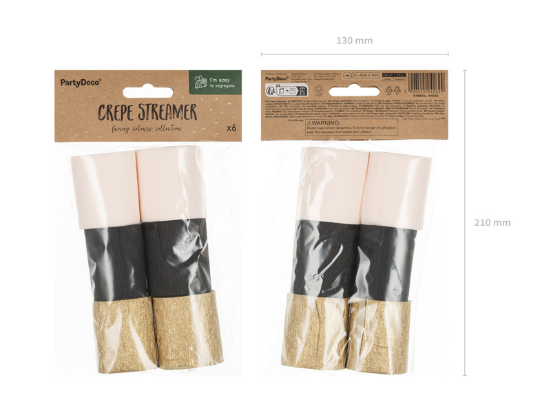 A Crepe szalag csomagban 6 darab, egyenként kb. 5 cm széles és 10 méter hosszú tekercs található, változatos fekete, arany és barack színekben. Többféle alkalomra kiváló választás, mint például ajándékcsomagolás, ünnepi dekoráció, születésnapi vagy esküvői díszítés.