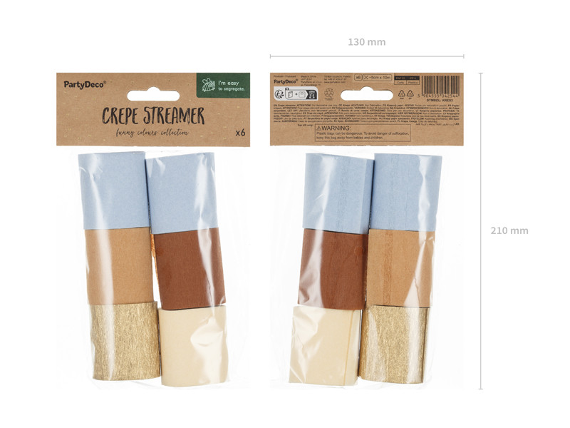 A kék és barna árnyalatú crepe szalagok ideális választás dekorációkhoz, ajándékok díszítéséhez vagy kreatív kézműves projektekhez. A csomag 6 darab, egyenként kb. 5 cm széles és 10 méter hosszú szalagot tartalmaz, melyek kiválóan kombinálhatók egymással vagy más dekorációs elemekkel.