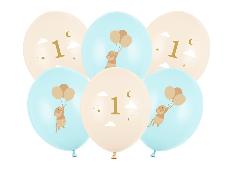 Ez a 30 cm átmérőjű erős, dupla oldalon nyomott egér mintás lufi szett 6 darabot tartalmaz, melyek pasztell világoskék és pasztell rózsaszín színekben érkeznek (3-3 db).