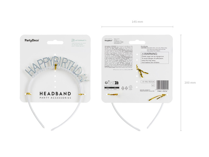 Ez az ezüst "Happy Birthday" felirattal díszített fejpánt gyöngyökkel teszi különlegessé a születésnapi megjelenést. Mérete 14 x 15,5 cm, kényelmes viseletet biztosít minden korosztály számára.