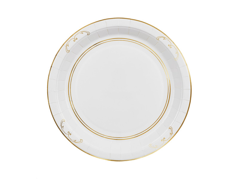 A 23 cm átmérőjű, fehér papírtányérok arany díszítéssel kiváló minőségűek és praktikusak.