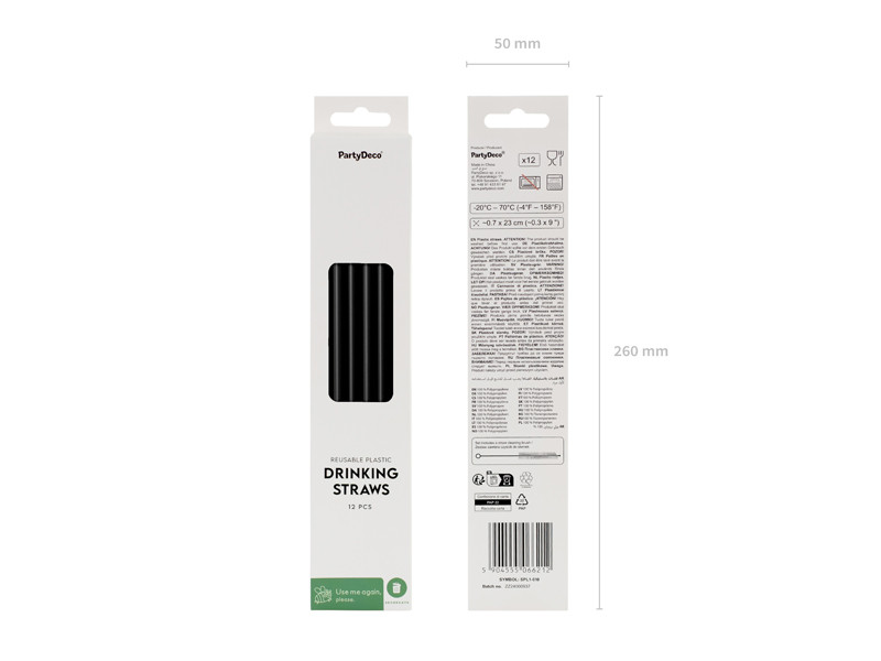 A fekete műanyag szívószálak 23 cm hosszúak, 7 mm átmérőjűek, így ideálisak üdítők, koktélok és egyéb hideg italok fogyasztásához.