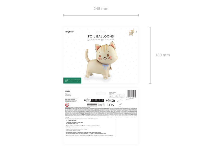 Világos bézs színű, macska formájú fólia lufi, mely guruló kerekekkel van ellátva, így különleges és szórakoztató dekorációs elem bármilyen ünnepi alkalomhoz.