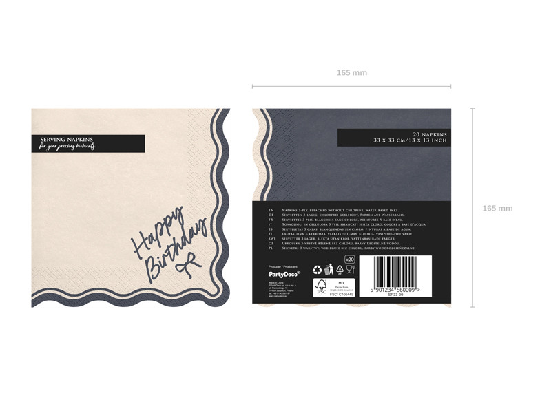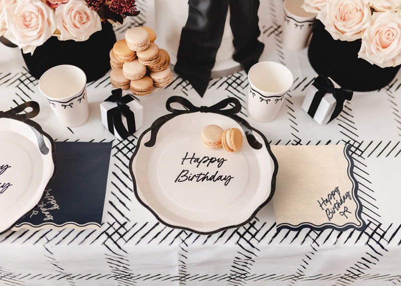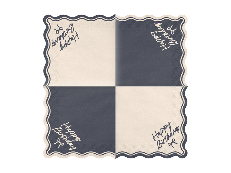 Kiváló minőségű, 2 rétegű papírból készült "Happy Birthday Bow" feliratos szalvéták, bézs és fekete színekben, amelyek elegáns hangulatot adnak bármilyen születésnapi összejövetelnek.