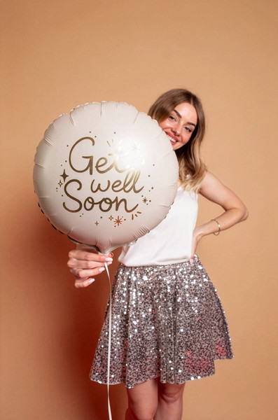 A kör alakú, bézs színű fólia lufi arany "Jobbulást!" felirattal ideális ajándék vagy dekoráció betegségek és gyógyulás időszakában.