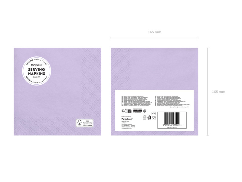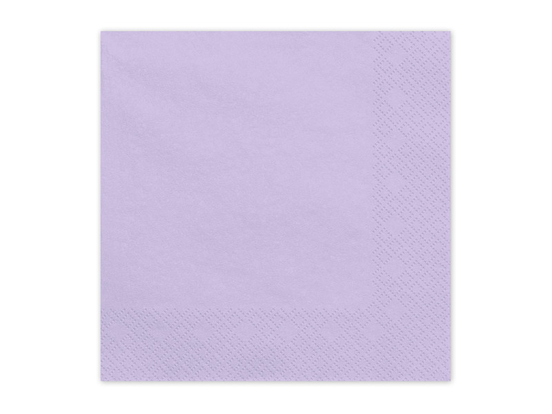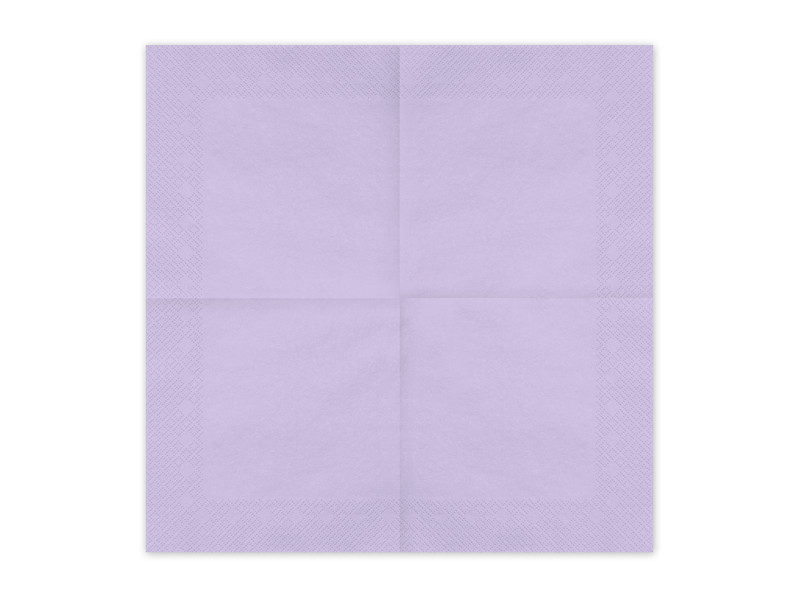 Levendula színű papírszalvéták, amelyek 33x33 cm-es méretben nyithatók ki és 16,5x16,5 cm-re hajthatók össze. 1 csomagban 20 darab található.