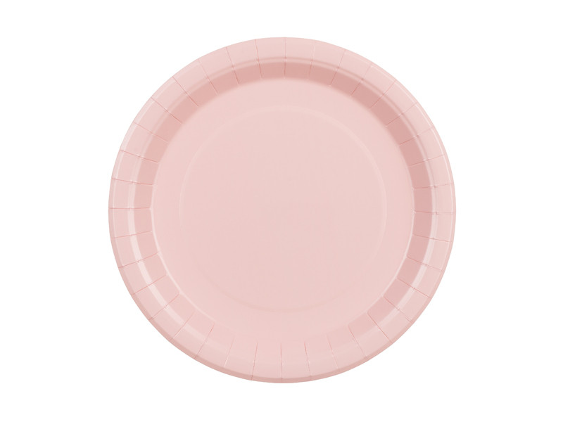 Világos rózsaszín, kör alakú papírtányérok, átmérőjük kb. 23 cm, 6 darabos csomagban.