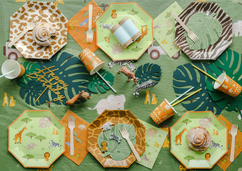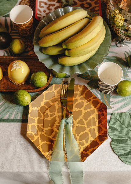 Egyedi Safari mintás papírtányérok, melyek zebramintával, leopárd foltokkal és zsiráf mintával díszítettek, változatos, vidám hangulatot teremtenek bármilyen alkalomra.
