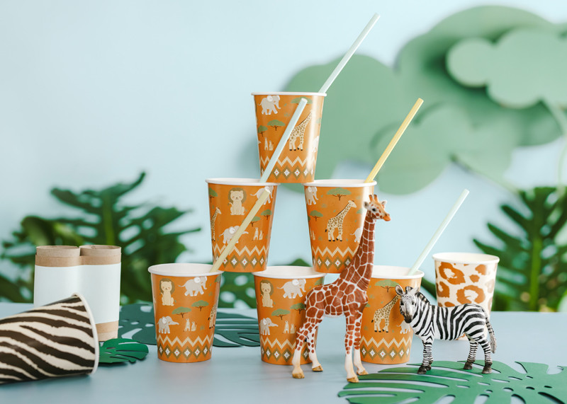 A Safari papír poharak élénk narancssárga színűek és különleges mintával díszítettek, így feldobják bármilyen rendezvény hangulatát. A 220 ml-es (kb. 7,4 oz) űrtartalom ideális hideg italok felszolgálásához, mivel nem alkalmasak meleg italokhoz.