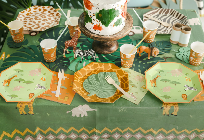 Egy csomagban 6 darab, kb. 23 cm átmérőjű papír tányér található, zöld alapszínnel, narancssárga szegéllyel és Safari motívummal díszítve.