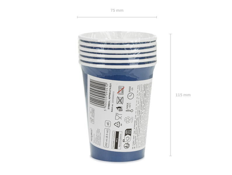 A sötétkék papír poharak 250 ml kapacitásúak, magasságuk körülbelül 9 cm, ideálisak hideg italok tálalására. Egyszer használatosak, higiéniásak és könnyen szállíthatók.
