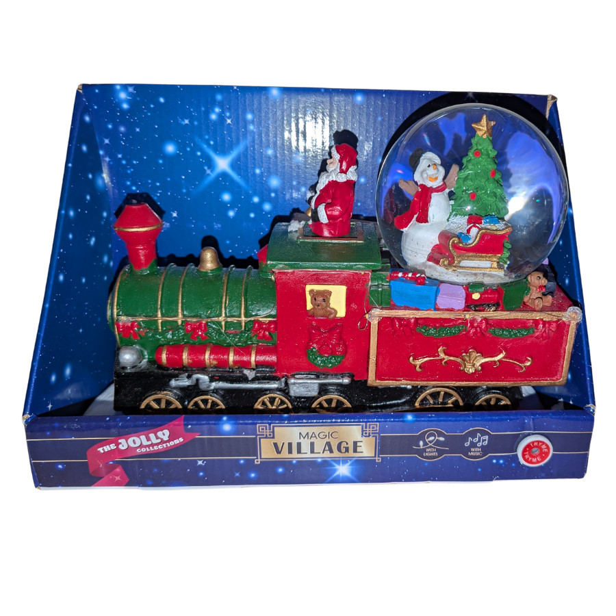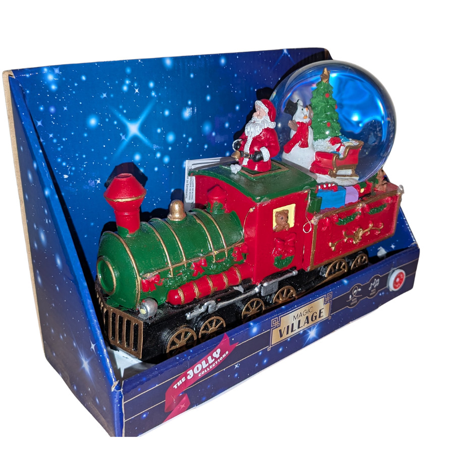 Karácsonyi vonat, ahol a Mikulás a masiniszta, és egy hóember van a hógömbben.