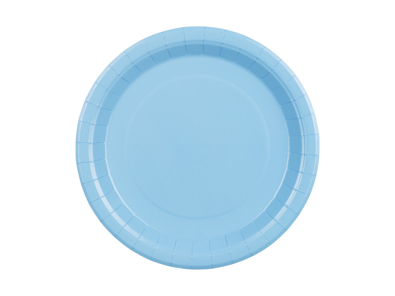 Világoskék, kerek papírtányérok 23 cm-es átmérővel, csomagonként 6 darabos kiszerelésben.
