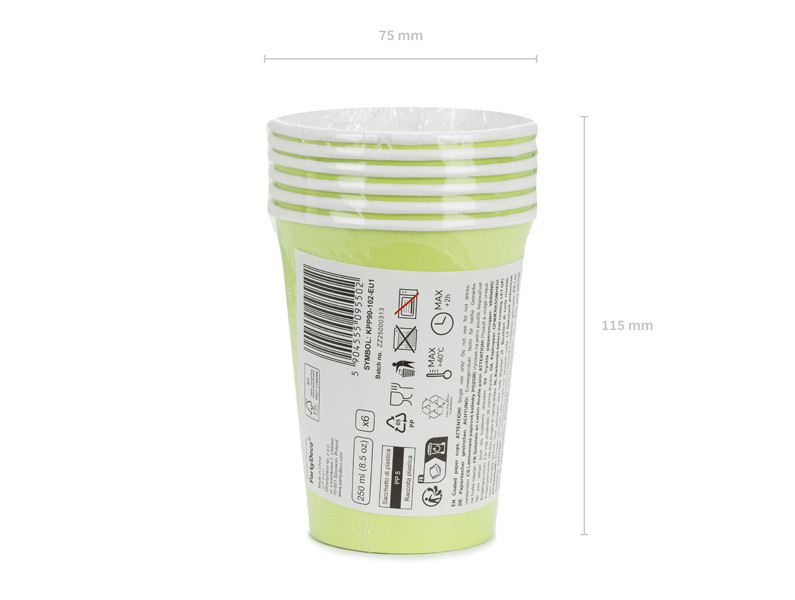 Világoszöld, egyszínű papír poharak 250 ml (8,5 oz) kapacitással, magasságuk kb. 9 cm. Egyszer használatos, környezetbarát termék, amely különösen alkalmas hideg italokhoz, mivel nem hőálló.