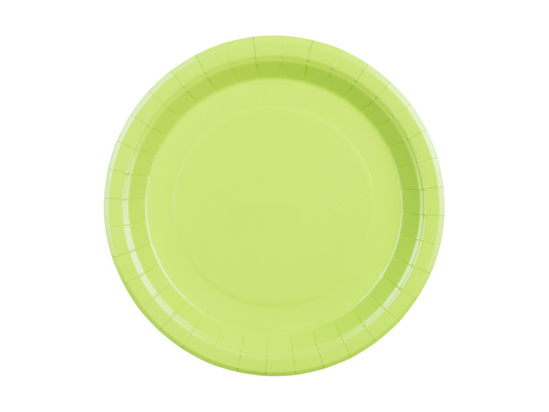 Kör alakú, világoszöld színű papírtányérok, átmérőjük kb. 23 cm, csomagolásban 6 darab található.